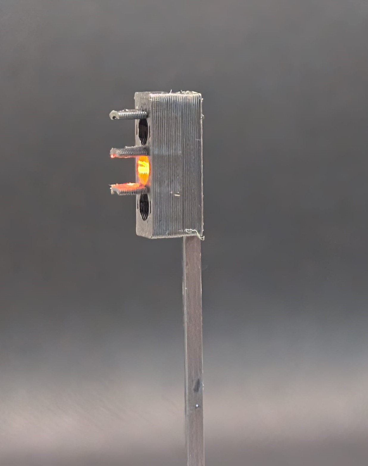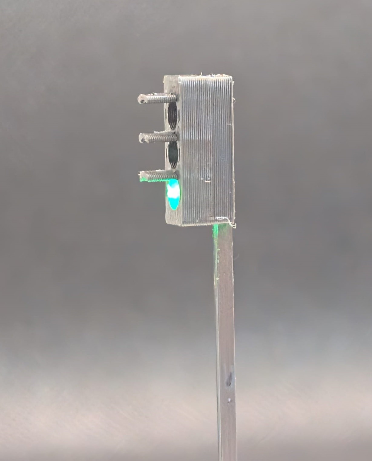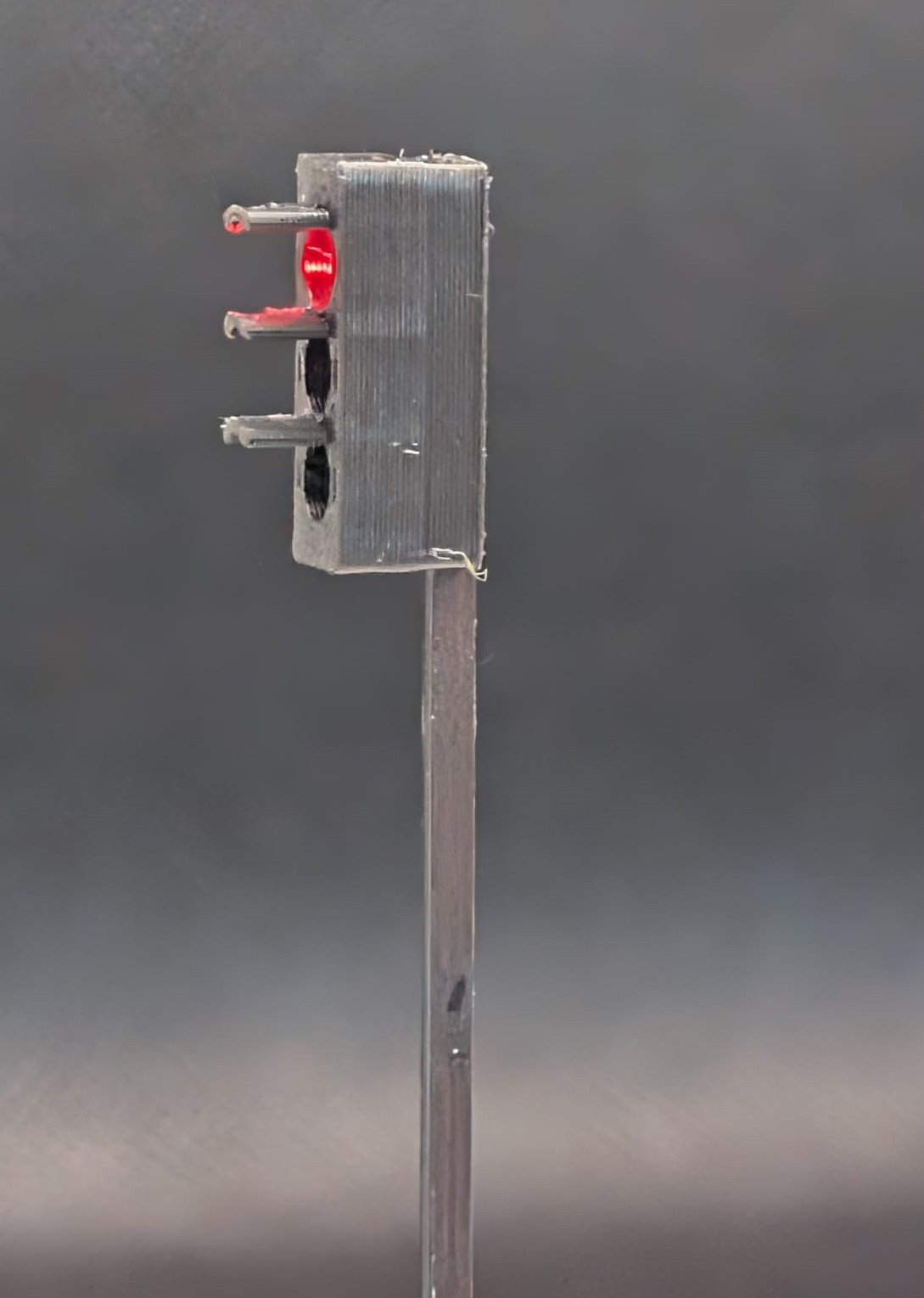 Traffic lights stand 48mm above the baseboard. A 6.5mm whole is drilled into the baseboard to allow the wires and base support stand to slot through.